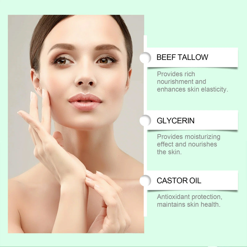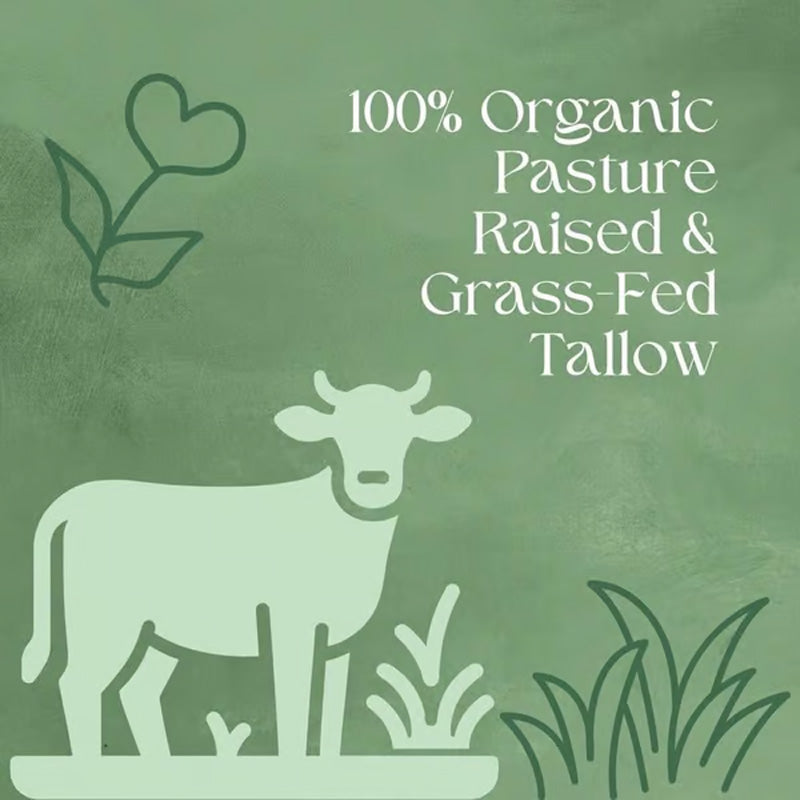 • Djup fuktighet: Ekologisk grĂ€smatad nötkötttalg levererar viktiga vitaminer och fettsyror för att Ă„terfukta och Ă„terstĂ€lla din huds naturliga lyster.