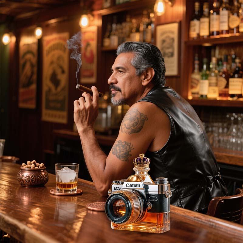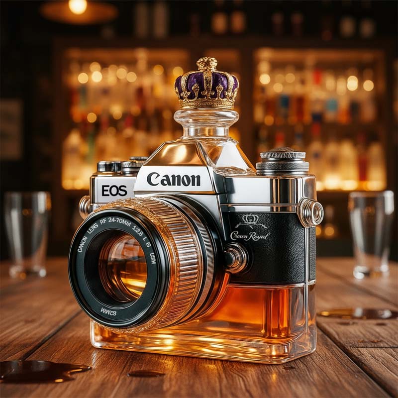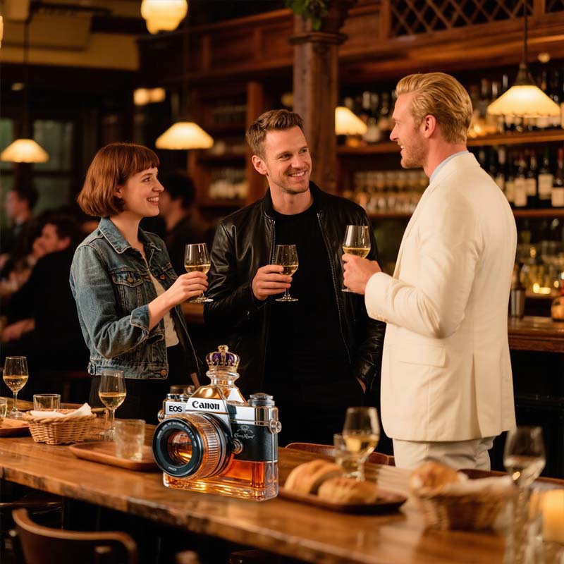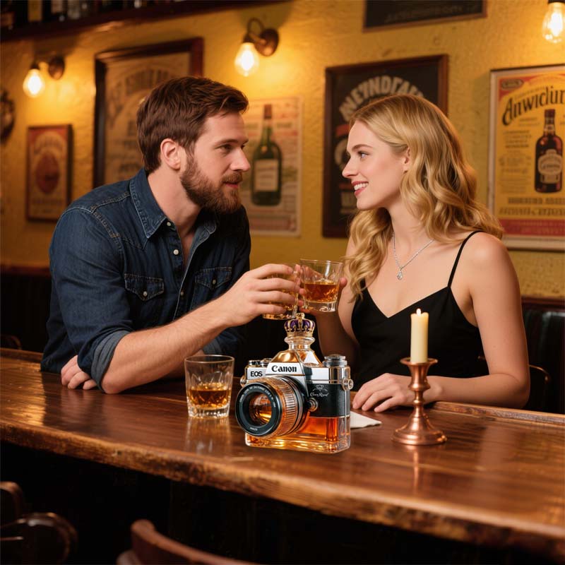 Varför nöja sig med ett enkelt glas när du kan rama in din drink som ett mästerverk? Denna kameraglasflaska inbjuder dig att pausa, beundra och kanske ta en bild innan du tar din första klunk.